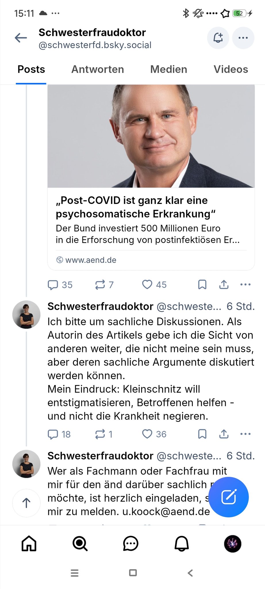 ), die vor Hass und Abscheu nur so trieften. Die Autorin wurde eher als affirmativ wahrgenommen, aber jedwede Abweichung vom Dogma bedeutet Verbannung in die Hölle. Das hilft nachträgliches Löschen nichts.ZitatIch rief in seiner ehemaligen Praxis an, um die Befunde anzufordern. Dabei konnte ich auch ein paar Sätze mit dem bis dahin betreuenden Hausarzt sprechen. "ME/CFS? Kenne ich nicht. Das ist psychosomatisch", sagte dieser. "Ich kenne ihn schon ewig, da kann man nichts machen."https://www.schwesterfraudoktor.de/2025/06/09/das-ist-doch-psychosomatisch-%C3%BCber-me-cfs/