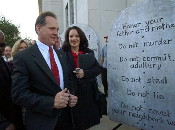 Former Alabama Chief Justice Roy Moore arrives at the Alabama Judicial Building in Montgomery on Nov. 12, 2003, to stand trial on an ethics charge that he failed to follow a federal court order when he refused to remove his Ten Commandments monument from public view in the building. (AP Photo)