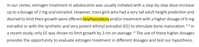 It was revealed in a paper published in the European Journal of Endocrinology in August 2023. The subject of the paper was the effect on bone mineral density on boys receiving estrogen. The paper suggests higher doses of estrogen prevent loss of mineral density, but also revealed that the boys were offered plate-fusion surgery in addition to or instead of higher doses of estrogen.
