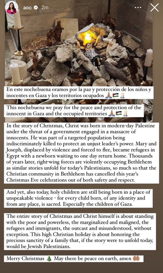 I can only describe Rep.AOC's Christmas Eve message-as hateful and dangerous .Comparing the death of Jesus to the current day death of Palestinians in Gaza and Mary and Joseph to current Palestinian refugees in Gaza- she invokes the charge that the Jews are again killing Jesus !