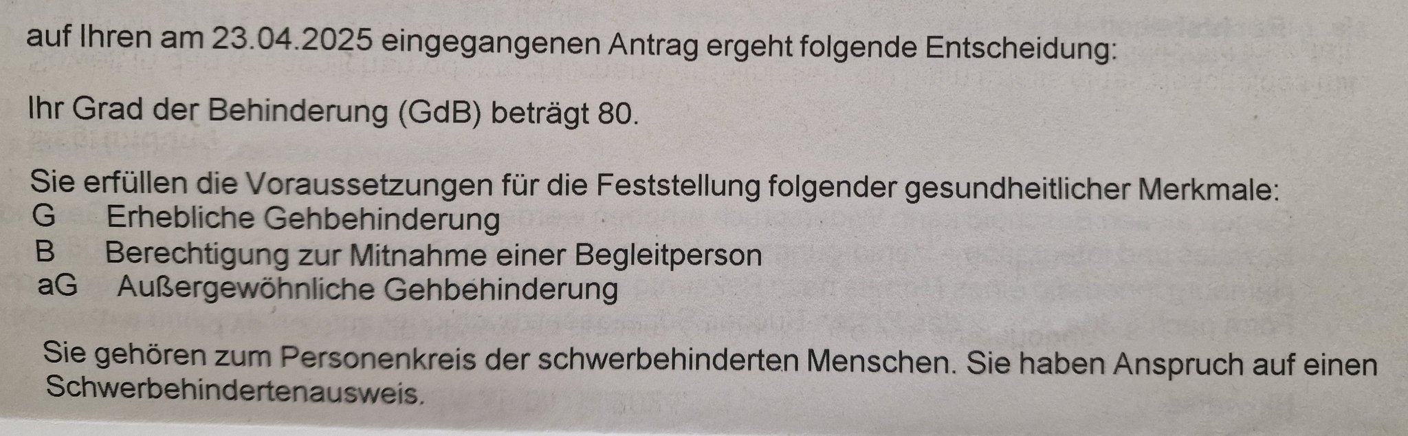 Ich habe mir von ChatGPT einen Brief schreiben lassen mit Argumentation und einen Arztbrief nachgeschickt, wo mein Neurologe betont hat, dass ich GdB von 80% bräuchte. Nach einer Woche Kam die Zusage. Ich denke,der Arztbrief war ausschlaggebend. Es gab nicht mal eine Begutachtung