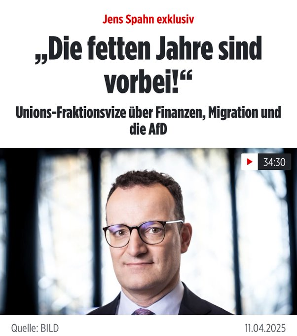 ZitatSpahn sagte der ,,Bild"-Zeitung, die anderen Parteien dürften sich nicht stets von der AfD provozieren lassen. Die Politik müsse anerkennen, wie viele Millionen Deutsche die AfD gewählt hätten. Bei den Verfahren und Abläufen im Bundestag empfehle er, mit der Partei so umzugehen, wie mit jeder anderen Oppositionspartei. Ein möglicher nächster Erfolg der AfD bei den kommenden Landtagswahlen im Osten sporne dazu an, Ergebnisse vor allem bei der illegalen Migration noch vor der Sommerpause zu liefern, betonte Spahn.