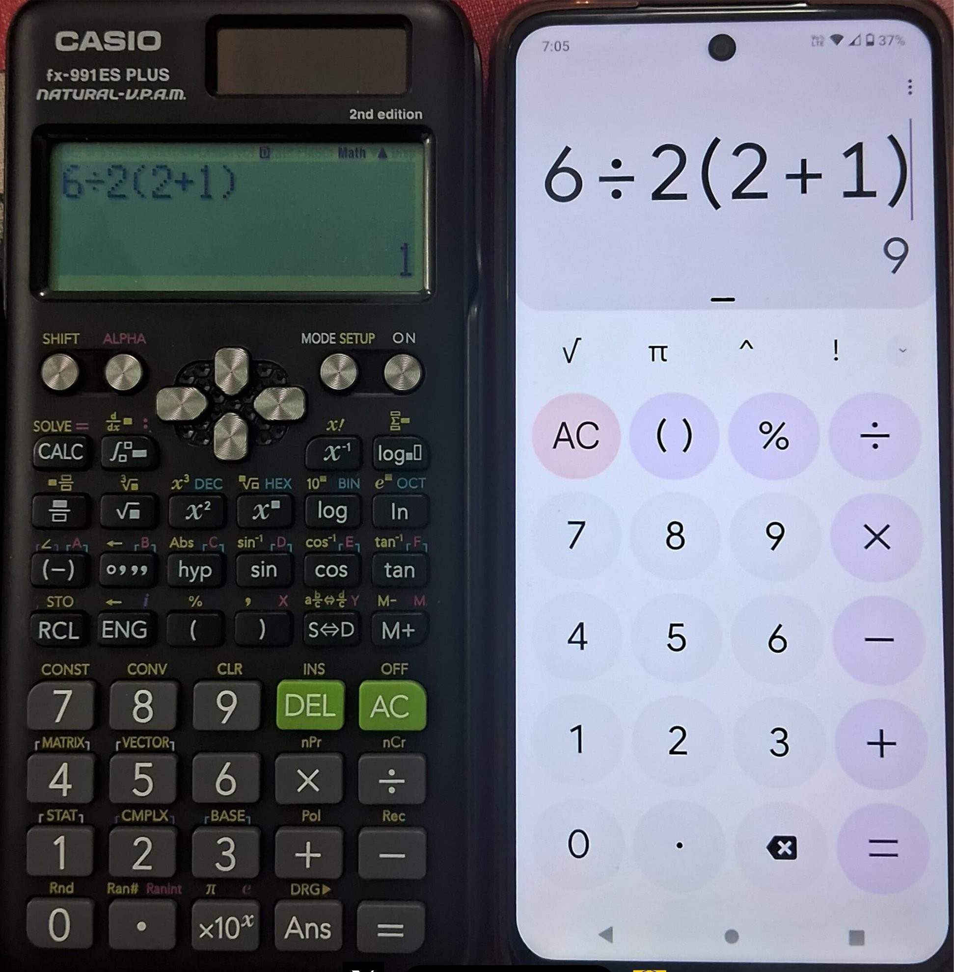 Hat mir heute morgen den Kaffee kalt werden lassen, weil ich mich darin vertieft hatte. Für mich war ja schnell klar, was das richtige Ergebnis ist. Ich komme da auf die 1, wie auch der Taschenrechner*. Aber es ist ggf. nicht so eindeutig. Über solch kleine Rechnereinen streitet scheinbar das gesamte Internet in epischen Schlachten. Dabei gibt es da keine absolute, reine Wahrheit. Kommt auf den Kontext an ::) . Wen es interessiert, ein längerer Faden auf X, der ein Lagebild von der Front vermittelt. Die Casionisten führen aktuell ;D